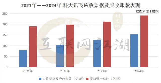 2020 年,科大讯飞的应收票据及应收账款总额尚且为 57.33 亿元,但现在,截止到 2024 年末,科大讯飞的"应收票据及应收账款"却已经达到了 153.1 亿元,整体占流动资产的 63.63%。